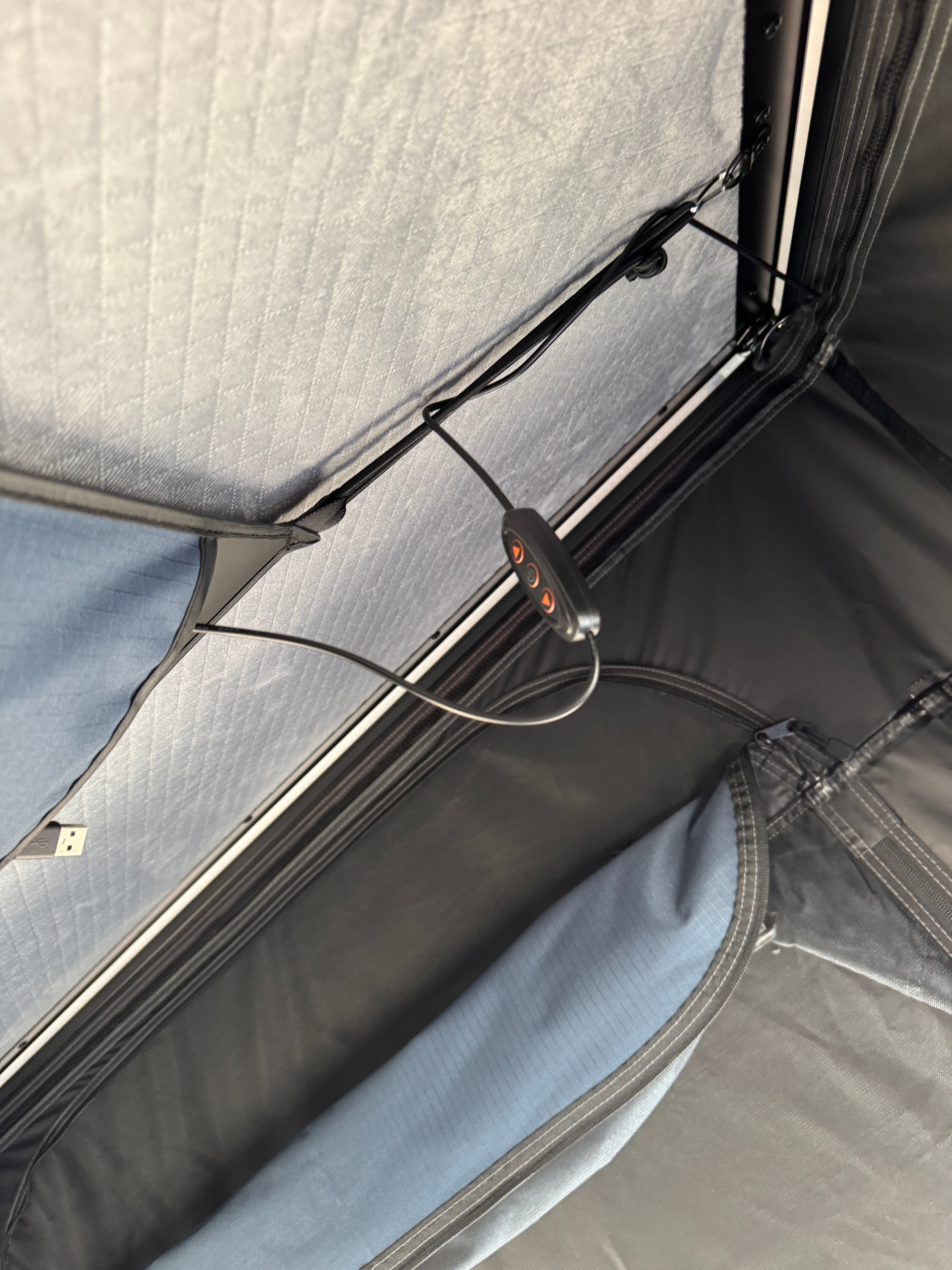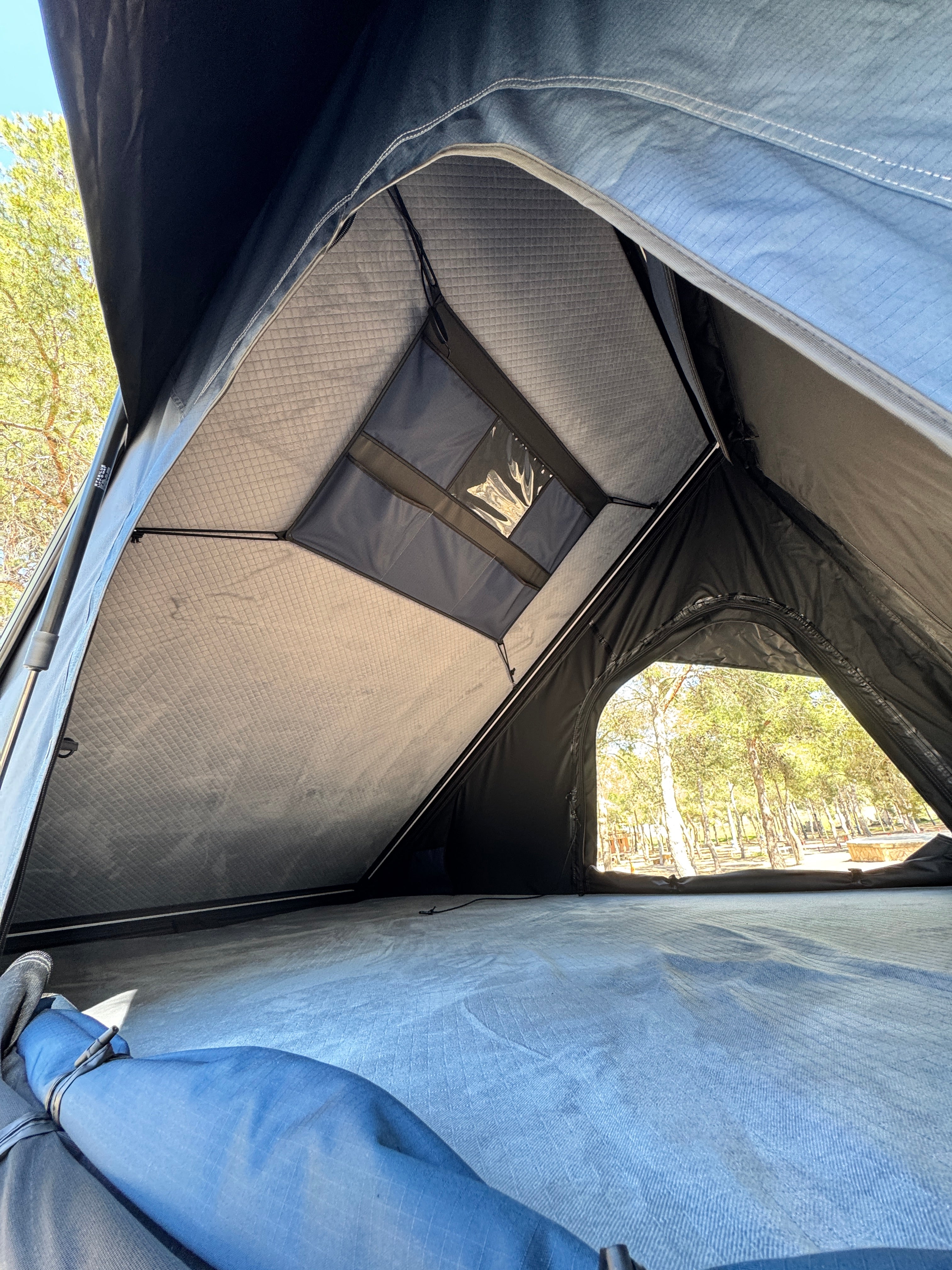 Roof top tent with rigid lid. With 360º vision. It is the closest thing to the elevating roof of a van. It is characterized by how narrow it is, only 22 cm, and yet it still has the capacity to store the ladder and bedding inside.